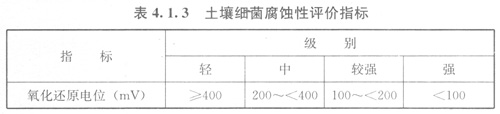 4.1.3當(dāng)存在細(xì)菌腐蝕時(shí),應(yīng)采用土壤氧化還原電位指標(biāo)判定土壤腐蝕性。土壤細(xì)菌腐蝕性評(píng)價(jià)指標(biāo)應(yīng)符合表4.1.3的規(guī)定。