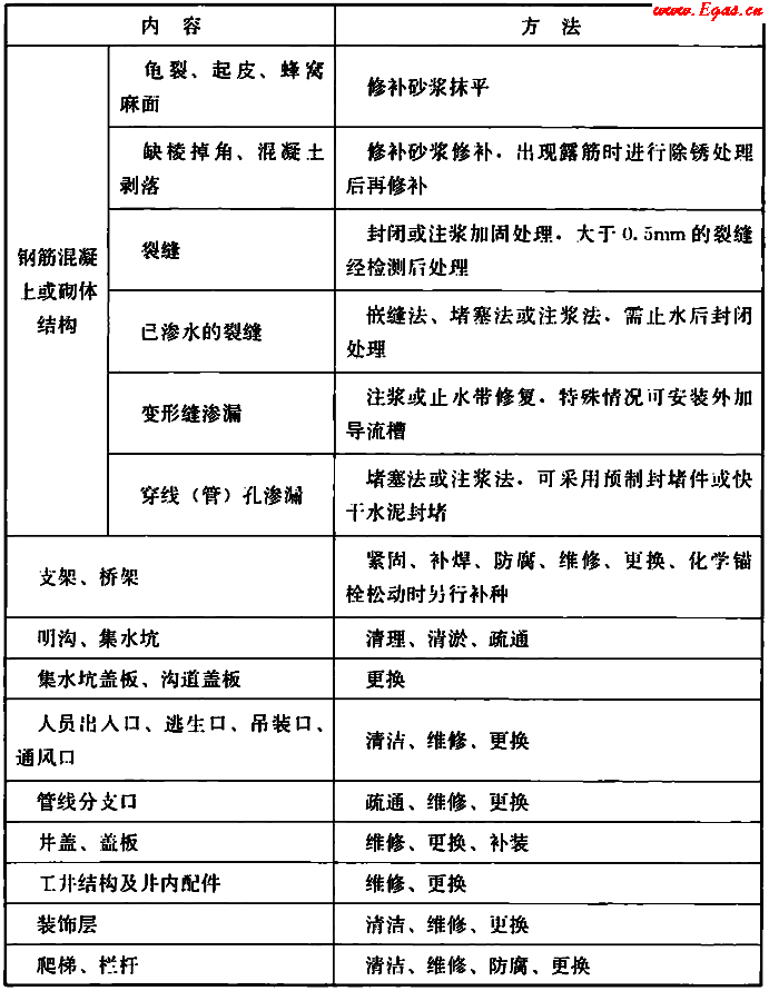 4.5.2 管廊本體維護(hù)內(nèi)容與方法應(yīng)符合表4.5.2的規(guī)定。