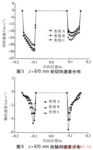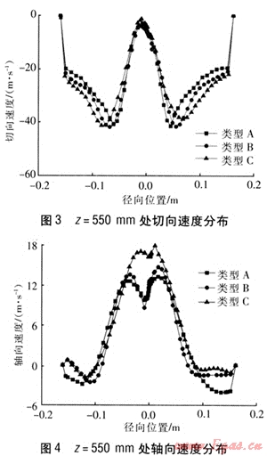 切向速度和軸向速度是影響旋風(fēng)分離器分離效率的重要因素,本文選取z=550、670mm高度上的軸向速度和切向速度,分析柱形空間和環(huán)形空間內(nèi)的切向速度和軸向速度分布。逆時(shí)針方向?yàn)榍邢蛩俣鹊恼较?,z軸正方向?yàn)檩S向速度的正方向。由于本文的旋風(fēng)分離器為順時(shí)針切向進(jìn)氣,因此分離器內(nèi)流體的切向速度為負(fù)。入口風(fēng)速為15m/s時(shí),3種類型的旋風(fēng)分離器在z=550mm高度上氣相流體的切向速度分布和軸向速度分布見圖3、4。由圖3、4可知,在柱形空間的外旋渦區(qū),類型A旋風(fēng)分離器壁面切向速度最小,類型B次之,類型C最大。即隨著高寬比的增大,旋風(fēng)分離器壁面附近的流體切向速度增大。類型A旋風(fēng)分離器的切向速度最大值的徑向位置離壁面最遠(yuǎn),類型B次之,類型C最近,即隨著高寬比的增大,切向速度的最大值的徑向位置逐漸向壁面靠攏。在旋風(fēng)分離器內(nèi),固體顆粒主要是在高速旋轉(zhuǎn)產(chǎn)生的離心力作用下從氣體中分離出來的。當(dāng)分離器的高寬比增大時(shí),壁面附近的切向速度變大,最大切向速度的徑向位置更靠近壁面。由于壁面切向速度變大以及外旋渦向壁面靠近,氣固兩相流中的顆粒所受的離心力變大,更容易擺脫氣相流體的牽引,被壁面捕集而被分離,從而提高分離效率。
