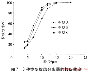 粒級效率是指某一給定粒徑或粒徑范圍的分離效率,切割粒徑是分離效率為50%時(shí)的顆粒粒徑。粒級效率圖可以清晰表明旋風(fēng)分離器對不同粒徑顆粒的分離性能。3種類型旋風(fēng)分離器的粒級效率見圖7。由圖7可知,類型B旋風(fēng)分離器的切割粒徑最小。3種類型旋風(fēng)分離器的分離效率分別為:A:88.71%,B:91.54%,C:90.27%。因此,當(dāng)入口高寬比增大或減小時(shí),分離器的切割粒徑都變大,從而使分離器的分離效果變差。在實(shí)際工程運(yùn)用中,應(yīng)當(dāng)保持旋風(fēng)分離器入口高寬比在一個(gè)合適范圍內(nèi),使得旋風(fēng)分離器具有最佳的分離效率。