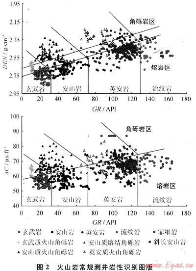 2) 建立火山巖地球物理測(cè)井響應(yīng)特征。首先完成了123塊樣品的全巖氧化物含量(特別是重礦物元素MnO、Fe203、TiO2等)和放射性元素(U、Th、K)含量分析,以針對(duì)性的實(shí)際資料證實(shí)了從基性到酸性火山巖U、Th、K的含量逐漸增大、放射性逐步增強(qiáng)以及重礦物含量逐漸減少的規(guī)律。然后以取心井為基礎(chǔ),用標(biāo)準(zhǔn)火山巖巖心標(biāo)定到測(cè)井曲線上,確定了不同巖性火山巖的典型測(cè)井響應(yīng)特征,強(qiáng)化了由基性巖到酸性巖自然伽馬值升高、密度降低、聲波時(shí)差值升高的基本規(guī)律。