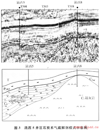 2006年通過井震結(jié)合對(duì)滴西5井區(qū)進(jìn)行了解剖,從巖性巖相變化模式確定滴西5和滴西8井區(qū)石炭系為不同的巖相巖體,認(rèn)為滴西5井以火山角礫巖為儲(chǔ)層,以安山巖為隔層,氣藏類型為受火山巖(角礫巖)巖性控制的層狀地層氣藏,而不是以前認(rèn)識(shí)的構(gòu)造氣藏(圖3)。
