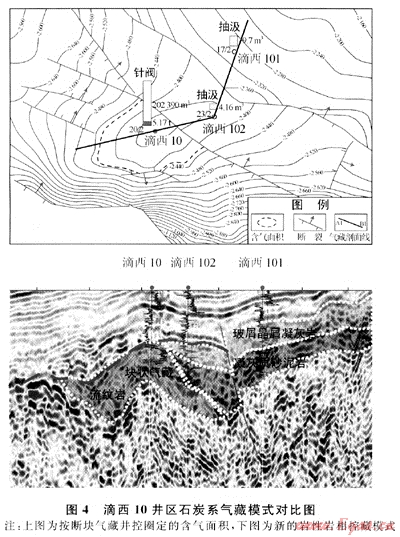 2) 滴西10井區(qū)。滴西10井鉆于2003年,石炭系巖性為流紋巖,2004年在石炭系試氣2層均獲得高產(chǎn)工業(yè)氣流。按照頂面構(gòu)造控藏模式,2004、2005年分別鉆探滴101井和滴102井2口評(píng)價(jià)井,石炭系巖性均為凝灰?guī)r,無油氣顯示。2005年底,按斷鼻構(gòu)造氣藏圈定滴西10井井控面積4.74km2(圖4中的上圖),探明天然氣地質(zhì)儲(chǔ)量20.20×108m3。2006年,對(duì)滴西10井區(qū)按巖性圈閉模式進(jìn)行了重新解釋,提出了新的氣藏模式(圖4中的下圖),并對(duì)滴102井進(jìn)行了加深鉆探以驗(yàn)證新模式。滴102井于3310m開始加深,3460m完鉆,至3340~3370m井段鉆遇流紋巖與滴西10井出氣段巖性一致。鉆探結(jié)果證實(shí)了新模式的正確性,指導(dǎo)了后續(xù)探井的部署。2008年,按照巖性巖相控藏模式,鉆探了滴103井和滴104井,均獲得成功,新增含氣面積13.57km2,新增探明天然氣地質(zhì)儲(chǔ)量83.07×108m3。