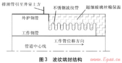 內外管之間設波紋端封。為避免事故狀態(tài)下井室進水導致保溫層進水,需將內外管之間封閉。但內外管相對位移較大,封閉裝置采用不銹鋼波紋端封形式,波紋端封補償量按內外管相對位移選取,經計算波紋端封補償量為1050mm。這樣有效地解決了保溫層進水及內外管相對位移的問題。波紋端封結構見圖3。