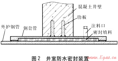 管道穿井室采用井室防水密封裝置,DN 600mm管道外管的外徑為1020mm,外管計算熱伸長為185mm,如果外管與井壁采用止水環(huán)剛性連接,限制外管的位移,則外管對井室的推力將達到6200kN。采用傳統的柔性密封方式可靠性較差。解決這一問題的方法有兩個:①外管加裝波紋管補償器,但又存在波紋管補償器長期浸于水中檢修、維護問題。②外管與井壁連接處采用防水性能較為可靠的井室防水密封裝置,此裝置結構與套筒補償器結構相似,確保了井室整體的防水性。經研究,在此工程中采用了井室防水密封裝置,通過專用注料器把密封填料通過注料口壓進填料空腔,這樣在保證外管自由伸縮的同時也阻止水滲漏入井室。井室防水密封裝置見圖2。