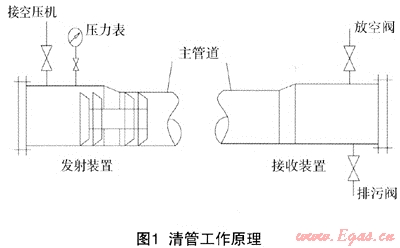 管道清掃時,將具有一定過盈量的清管器置于管道中,使之外沿與管道內(nèi)壁形成良好的彈性密封,然后輸入介質(zhì)(通常為壓縮空氣或水),使清管器前后產(chǎn)生足夠的壓差,推動清管器在管內(nèi)運行(如圖1)。