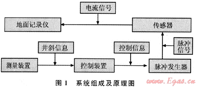 圖1是整個(gè)系統(tǒng)的組成及工作原理圖。整個(gè)系統(tǒng)的工作原理是:井下儀器的測(cè)量裝置測(cè)得的井斜信息通過一定的機(jī)構(gòu)傳遞給控制裝置,控制裝置將井斜信息轉(zhuǎn)換為控制信息,從而控制脈沖發(fā)生器產(chǎn)生脈沖信號(hào),脈沖信號(hào)通過鉆井液傳遞到地面,立管上的傳感器檢測(cè)到壓力脈沖信號(hào)并由地面記錄儀打印出來,并根據(jù)脈沖信號(hào)的數(shù)量顯示出井斜的大小。