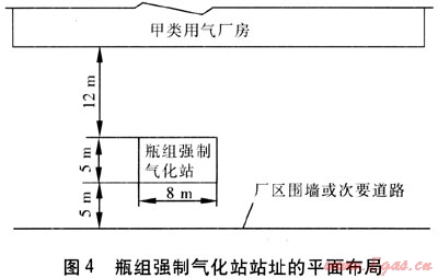 總?cè)莘e小于4m3的瓶組強(qiáng)制氣化站站址的平面布局見圖4。