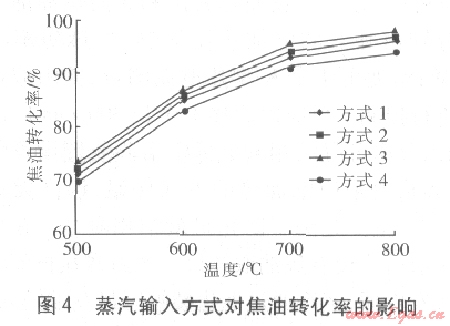 4種蒸汽輸人方式對焦油轉化率的影響見圖4。由圖4可知,蒸汽輸入方式對焦油轉化率有一定的影響。方式2和方式3的焦油轉化率比方式1高,說明將蒸汽按照一定比例、在不同位置輸入催化裂解區(qū)有利于焦油的催化裂解。因為這兩種輸入方式可使焦油與蒸汽多次接觸,延長了反應時間,分段輸入蒸汽也更加有利于生物質(zhì)炭的活化和清除催化劑表面的焦油裂解炭。方式4的焦油轉化率比其他3種方式都低,說明蒸汽對焦油的催化重整主要發(fā)生在催化裂解區(qū)的前部,后部效果不太明顯。因此在實際設計催化裂解器時,可以將蒸汽按比例、分區(qū)輸入,有利于焦油的裂解。