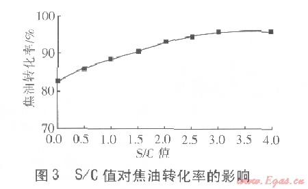 ③在一定范圍內(nèi),焦油轉化率隨S/C值的增大而提高。當S/C值達到一定值后,隨著S/C值的增大,焦油轉化率變化較小,說明焦油內(nèi)的部分穩(wěn)定成分通過單純增加蒸汽量已不能裂解。