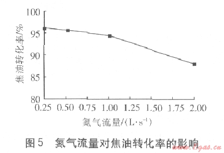 由圖5可知,隨著氮氣流量的增加,焦油轉化率從96.0%降至88.1%,變化趨勢是先慢后快。因為隨著氮氣流量的增加,焦油和生物質(zhì)炭與蒸汽的接觸時間變短,導致焦油不能充分裂解。
