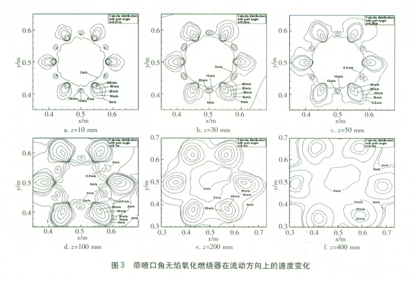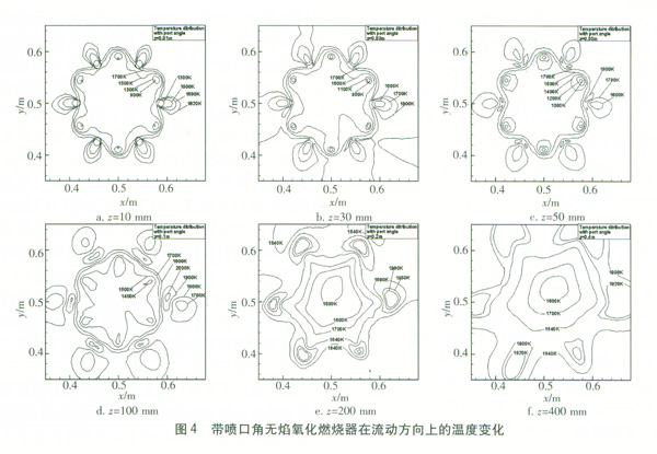 圖4給出了帶噴口角無焰氧化燃燒器溫度沿燃燒器軸線方向的變化情況。從圖4a可看出,燃燒器區(qū)域的最高溫度1 700 K位于空氣射流的某個半徑處,這表示空氣射流卷吸其附近的天然氣和燃燒產(chǎn)物使氧化劑、燃料和產(chǎn)物的比例在該空氣射流半徑處達(dá)到最佳的狀態(tài)。燃燒首先在那里發(fā)生,朝空氣射流中心的周圍擴散。當(dāng)流動進(jìn)一步向下游推進(jìn)時,燃燒強度進(jìn)一步增加,溫度逐漸上升,最高溫度大約出現(xiàn)在z=100 mm處。在z=100mm之后,由于燃料大部分被燃燒,溫度又開始逐漸降低,并且由于混合更充分,溫度也變得更均勻。另外,由于噴嘴沿軸心具有向外的傾角,沿著軸線方向射流問的間隔也變得越大(即從射流整體運動來看,它像一個圓錐擴展運動,因此沿著石方向,即圓錐軸線方向,在圓錐橫截面上的各分射流間隔越來越大),在空氣射流和燃料射流混合之前,它們更充分地被燃燒產(chǎn)物所稀釋,燃燒區(qū)域更大,因此最高溫度也較低。