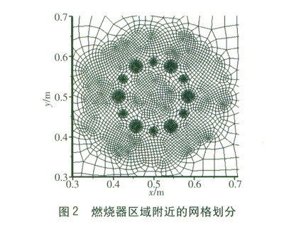 數(shù)值求解的精度與網(wǎng)格的類型和密度緊密相關(guān)。本研究中燃料口和空氣口的尺寸與整個爐膛的尺寸相比很小,由于在燃燒器內(nèi)同時進(jìn)行著流動、傳熱和化學(xué)反應(yīng),因此在此附近區(qū)域的熱力參數(shù)變化激烈,此區(qū)域的網(wǎng)格必須有更小的尺寸以適應(yīng)參量的劇烈變化。圖2為主流方向某個面上燃燒器附近區(qū)域的網(wǎng)格劃分。
