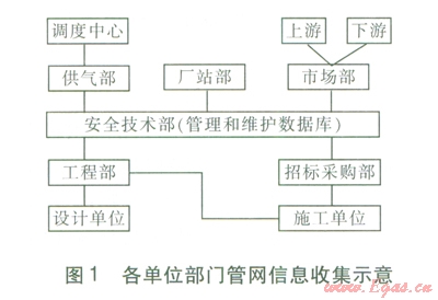 燃?xì)夤局信c城鎮(zhèn)燃?xì)夤芫W(wǎng)基礎(chǔ)信息數(shù)據(jù)庫管理直接相關(guān)的部門包括安全技術(shù)部、供氣部、廠站部、市場部、工程部、招標(biāo)采購部。安全技術(shù)部主要負(fù)責(zé)向工程部和供氣部提供安全運行、管理、維護(hù)方面的技術(shù)支持;風(fēng)險評價工作由安全技術(shù)部開展。供氣部主要負(fù)責(zé)城市輸配管網(wǎng)的安全運行,巡線、事故搶修,供氣部的調(diào)度中心負(fù)責(zé)管網(wǎng)及廠站運行信息的采集和分析,并發(fā)布指令。廠站部主要負(fù)責(zé)廠站的日常運行和維護(hù)。市場部主要負(fù)責(zé)向上游購氣,并將燃?xì)怃N售給下游的用戶。工程部主要負(fù)責(zé)與設(shè)計單位交流,提出設(shè)計要求,并收集設(shè)計方面的信息。招標(biāo)采購部主要負(fù)責(zé)招標(biāo)設(shè)計單位和施工單位,采購施工設(shè)備及材料。