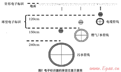 用于標(biāo)識燃?xì)夤艿?、供水管道、污水管道電纜的電子標(biāo)識器各自的安裝位置示意圖如下圖2所示。