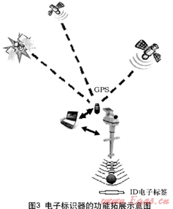 圖3是電子標(biāo)識器的功能拓展示意圖,由GPS現(xiàn)場記錄電子標(biāo)識器的經(jīng)度、緯度、海拔高度等信息,將數(shù)據(jù)上傳到電子地圖系統(tǒng),由此記錄標(biāo)識器所在位置的絕對坐標(biāo)[4]。
