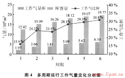 工作氣能力快速提高,工作氣比例總體增加,其變化示意圖見(jiàn)圖4。經(jīng)過(guò)6個(gè)周期后,工作氣量由1.97×108m3增至6.10×108m3,增加2.1倍。工作氣比例由15.9%增至30.8%,增幅為90%。