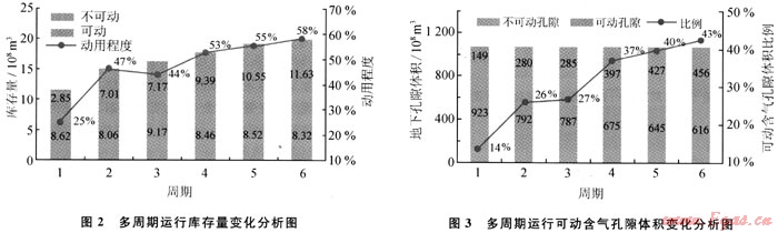 可動(dòng)用庫(kù)存量逐漸增加,不可動(dòng)用庫(kù)存量總體略有降低,庫(kù)存的動(dòng)用程度隨之增加,其變化示意圖見(jiàn)圖2。經(jīng)過(guò)6個(gè)周期后,可動(dòng)用庫(kù)存量由2.85×108m3增至11.63×108m3,增加了3.1倍;不可動(dòng)用庫(kù)存量由8.62×108m3降至8.32×108m3,降幅為3.5%;庫(kù)存動(dòng)用程度從25%增至58%,提高了1.3倍,但目前仍有42%庫(kù)存不可動(dòng)用。