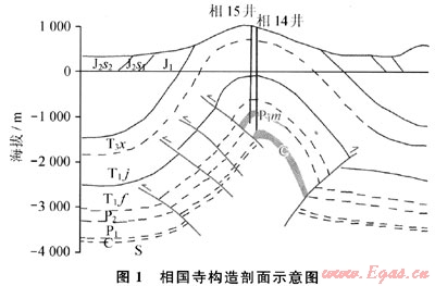 1) 相國寺石炭系氣藏構(gòu)造形態(tài)為狹長梳狀背斜。構(gòu)造兩翼均發(fā)育有大型傾軸逆斷層,斷層向上消失于須家河組,向下則斷達(dá)志留系,斷層未破壞構(gòu)造、地層的完整性,對氣藏起到封閉作用(圖1)。