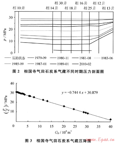 4) 相國寺石炭系氣藏原始?xì)馑缑婕s-2000m,處于構(gòu)造低部位,在整個開發(fā)史中,氣藏產(chǎn)水量較小,動態(tài)監(jiān)測也表明,邊水未侵入氣藏,氣藏內(nèi)水體不活躍。