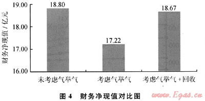 經(jīng)濟指標(biāo)為財務(wù)內(nèi)部收益率,財務(wù)凈現(xiàn)值,靜態(tài)投資回收期,動態(tài)投資回收期,投資利潤率和投資利稅率[6]。根據(jù)經(jīng)濟指標(biāo)得出:3種情況的財務(wù)內(nèi)部收益率均大于30%,大于石油財政基準(zhǔn)收益率12%;若增添壓縮機,則投資成本能夠在1a內(nèi)收回;靜態(tài)和動態(tài)投資回收期均小于1a。如圖4,添加壓縮機回收低壓氣比目前壓縮機生產(chǎn)的財務(wù)凈現(xiàn)值能多獲得1.45億元。