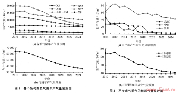 2) 不考慮氣舉氣時,目前的壓縮機能夠滿足氣田低壓氣回收的要求,2010~2025年可回收低壓氣為35.92×108m3;考慮氣舉氣時,需在2010~2016年增添壓縮機,若添置壓縮能力為20×104m3/d的壓縮機,則2011年、2012年和2014年需要2臺,其他時間只需1臺,預(yù)計可回收低壓氣47.26×108m3。