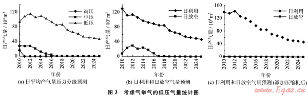 出于經(jīng)濟考慮,日產(chǎn)氣量低于1×104m3的低壓氣不考慮回收,如果統(tǒng)一添加壓縮能力為20×104m3/d的壓縮機,那么添置情況為2010年1臺,2011年和2012年2臺,2013年1臺,2014年2臺,2015年和2016年1臺。添加壓縮機之后,日利用和日放空氣量預(yù)測情況如圖3-c,預(yù)計到2025年累計可回收低壓氣為47.26×108m3,比放空方案多回收4.79×104m3。