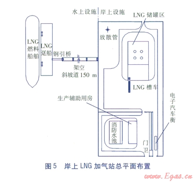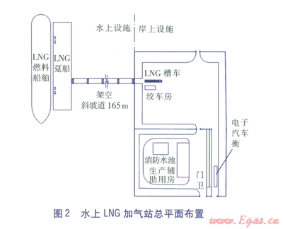 該方案是將LNG的裝卸、儲存及配套的供電、消防、控制設(shè)施設(shè)在岸上的LNG站區(qū)內(nèi),水上的躉船上不設(shè)LNG儲罐,只設(shè)LNG加氣機、加氣臂等加氣設(shè)施,進行岸上儲存、船上加氣作業(yè)。