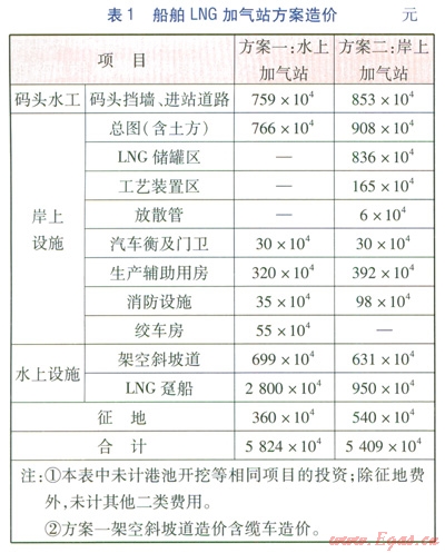 結(jié)合上述水上LNG加氣站方案、岸上LNG加氣站方案的建設(shè)內(nèi)容,對兩個方案進行技術(shù)經(jīng)濟比較。船舶LNG加氣站方案造價見表1。