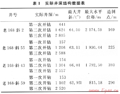 所采取的具體措施:①該叢式井組第一次開鉆采用老漿開鉆,小循環(huán)鉆進(jìn),向鉆井液中不斷補(bǔ)充天然高分子強(qiáng)抑制性包被絮凝劑(IND-30)及高分子包被絮凝劑(ZH-O2),利用高分子聚合物的絮凝作用及聚合物間的交聯(lián),協(xié)同能力提高鉆井液的抑制能力;②對于淺地層(平原組)大井眼定向的井(如老168-斜55、老168-斜43、老168-斜59井),當(dāng)井斜達(dá)到30°左右時及時混入原油,并根據(jù)進(jìn)尺情況加以補(bǔ)充,以提供足夠的潤滑性來降低摩阻及扭矩;③鉆進(jìn)過程中保持足夠的排量(≥55L/s),充分清洗井眼攜帶巖屑;④鉆完第一次開鉆井深,用前井回收的老漿并加入2%的白油封裸眼井段,確保表層套管的順利下入。
