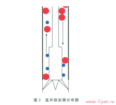 由于管流運動與巖屑顆粒重力的方向性差異,直井段與水平井段巖屑運移規(guī)律大為不同(圖1、2)。由圖l可以看出:在鉆頭破巖后大顆粒尺寸巖屑在鉆鋌處由于流速高可以較為順暢地運移;到了鉆鋌與鉆桿交界處由于環(huán)空面積陡然增加,大顆粒巖屑可能發(fā)生堆積。對比直井段與水平井段,直井段中較大巖屑會回落至井底重復破碎;而水平井段一旦產生流體所不能攜帶的大顆粒巖屑,這些巖屑只會停留在下井壁等待鉆具的碾壓直至形成小顆粒才被流體順利攜走。