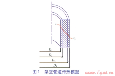 架空敷設(shè)熱水供熱管道(以下簡稱架空管道,由工作鋼管、保溫層、保護(hù)層構(gòu)成)傳熱模型見圖l,單位長度架空管道熱損失q的計算式為[1]: