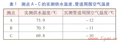 當(dāng)室外溫度比較接近時,測點(diǎn)A~C的實(shí)測供水溫度、管道周圍空氣溫度見表l。