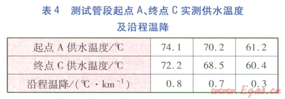 對測試管段的起點(diǎn)A、終點(diǎn)C的供水溫度進(jìn)行了3次測量,計算供水沿程溫降。實(shí)測供水溫度及沿程溫降見表4。由表4可知,隨著供水溫度的提高,供水沿程溫降呈上升趨勢。