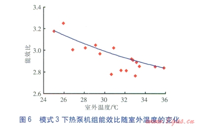 模式1下熱泵機(jī)組制冷性能系數(shù)隨室外溫度的變化見(jiàn)圖l,圖中紅色點(diǎn)為實(shí)測(cè)數(shù)據(jù)點(diǎn),平滑曲線為擬合曲線:ICOP=0.0046q2-0.3224q2+8.2426,q為室外溫度(單位為℃)。由圖1可知,模式1下熱泵機(jī)組制冷性能系數(shù)隨室外溫度的升高而降低,且下降速率較快。這說(shuō)明空氣源熱泵的性能易受室外溫度影響,當(dāng)室外溫度升高時(shí),冷凝器的工作環(huán)境惡化,制冷劑甚至不能及時(shí)液化,直接導(dǎo)致熱泵機(jī)組的制冷性能系數(shù)下降。模式l下熱泵機(jī)組能效比隨室外溫度的變化見(jiàn)圖2,圖中紅色點(diǎn)為實(shí)測(cè)數(shù)據(jù)點(diǎn),平滑曲線為擬合曲線:IEER=0.0038q2-0.2606q+7.0016。由圖1、2可知,模式1下熱泵機(jī)組能效比隨室外溫度的升高而降低,變化趨勢(shì)與制冷性能系數(shù)基本一致。