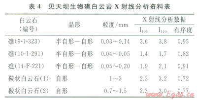 從天壩生物礁白云巖X射線分析資料(表4)中不難看出,礁白云巖的3個樣品白云石晶體的粒度為0.03~0.25mm,晶形為半自形一自形晶,有序度分別為0.95、0.82和0.91,具有高的有序度。