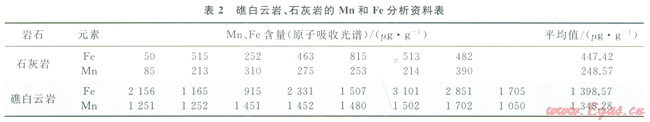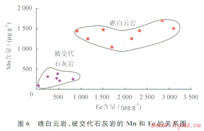 礁白云巖、白云石化母巖——石灰?guī)r的Mn和Fe的分析資料見表2。白云石化母巖石灰?guī)r的Mn和Fe含量分別為85~390mg/g和50~815mg/g;平均值分別為248.57和447.42mg/g。白云巖的Mn和Fe含量分別為1050~1702mg/g和915~3101mg/g,平均值分別為1348.28mg/g和1398.57mg/g。