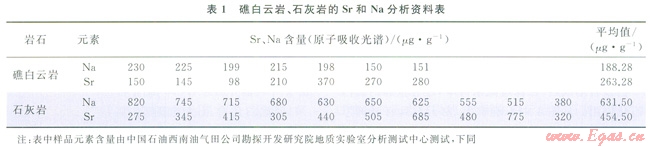 礁白云巖和白云石化母巖——石灰?guī)r的Sr和Na的分析資料如表1所示??梢钥闯觯航赴自茙r的Sr和Na含量分別為98~370mg/g和150~230mg/g;平均值分別為263.28/mg/g和188.28mg/g。白云石化母巖——石灰?guī)r的Sr和Na含量分別為275~480mg/g和380~745mg/g;平均值分別為454.50mg/g和631.50mg/g。