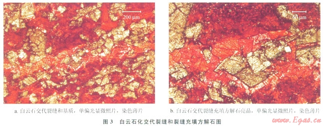 白云石化不僅與縫合線關(guān)系密切,而且在礁自云巖中還可見白云石交代構(gòu)造裂縫和充填裂縫的亮晶方解石。圖3為染色薄片顯微照片,可清楚地看出有構(gòu)造裂縫和裂縫充填的亮晶方解石,白云石覆蓋在構(gòu)造裂縫上,也覆蓋在裂縫充填的亮晶方解石上。白云石對裂縫和裂縫充填亮晶方解石的交代現(xiàn)象十分明顯。