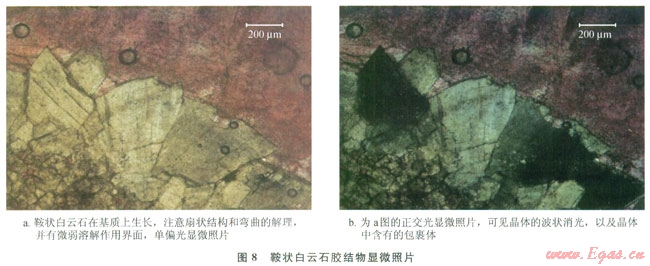 見天壩生物礁白云巖中存在許多鞍狀白云石膠結(jié)物,其通常出現(xiàn)在次生孔隙中,以孔隙充填方式出現(xiàn),并和基質(zhì)白云石共生。這些鞍狀白云石晶體粗,白形程度高(自形一半自形),通常具有解理,有時含有固體包裹體,單偏光下呈溶蝕狀,正交光下具有明顯的波狀消光(圖8)。