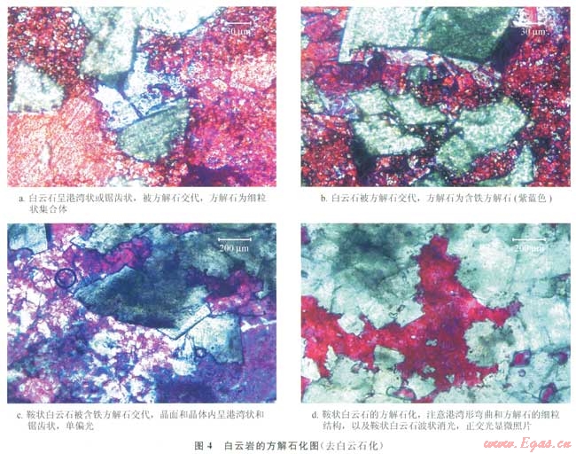 白云巖形成后,在深埋藏條件下,還有微弱的去白云石化作用。從圖4中不難看出,白云石具有港灣形彎曲和被鐵方解石交代殘留的特征。去白云石化或方解石化的交代物為鐵方解石,顯示藍色或淺藍色(混合液鐵氰化鉀+茜素紅—S染色),晶體為細粒狀集合體(圖4)。這與白云石化時交代裂縫方解石顏色(紅色)和結(jié)構(gòu)(粗品質(zhì))是不一樣的。白云石的方解石化顯然是在深埋藏條件下與流體成分變化有關(guān),即還原條件下pH值變化(偏酸性),流體富含Fe離子有關(guān)。