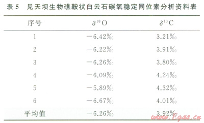 鞍狀白云石的碳氧穩(wěn)定同位素分析資料見表5。不難看出,鞍狀白云石的d18O=-5.89‰~-6.67‰,d13C=3.21‰~4.32‰,平均值分別為-6.26‰(d18O)和3.92‰(d13C)。