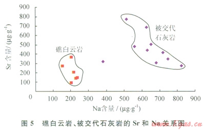 從礁白云巖、石灰?guī)r的Sr和Na關(guān)系圖上(圖5)不難看出,白云巖比被交代母質(zhì)石灰?guī)r具有較偏低的Sr和Na值,這種現(xiàn)象是怎么發(fā)生的呢?