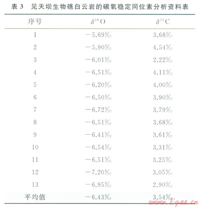 見天壩生物礁白云巖的碳氧穩(wěn)定同位素分析資料見表3。可以看出,礁白云巖的穩(wěn)定同位素值(PI)B標準,下同)為d18O=5.69‰~-7.20‰;d13C=+2.22‰~+4.54‰;平均值分別是-6.43‰(d18O)和+3.54‰(d13C)。要正確了解礁白云巖的這些穩(wěn)定同位素值在白云石化作用中的含義,還需要把其放在海水的穩(wěn)定同位素值中進行對比,因為海水的穩(wěn)定同位素碳和氧值是白云石成因解釋的基礎(chǔ)(圖7)。