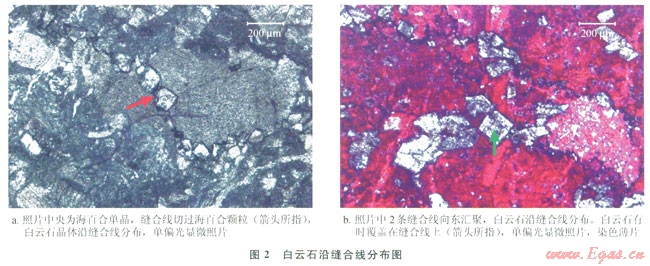 圖2為礁翼部的白云石化生物礁灰?guī)r,有縫合線和沿縫合線附近分布的分散白云石。不難看出,白云石沿縫合線分布,白云石可以覆蓋在縫合線上,這就表明白云石化作用發(fā)生在縫合作用過程中或縫合作用之后,似乎縫合線可以作為白云石化流體的通道。