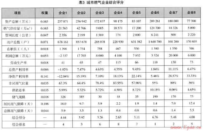 根據(jù)已經(jīng)建立的評價體系,我們對國內12家運營較規(guī)范燃氣企業(yè)進行了調研,并從中選擇數(shù)據(jù)反饋完整的8家企業(yè)進行比較。根據(jù)8家企業(yè)經(jīng)營指標(截止至2010年底)的相對優(yōu)劣,分別計算每個企業(yè)每個項目得分(0分-10分),各項加權匯總后為企業(yè)綜合得分。(見表3)