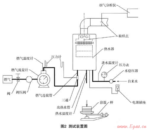 (1) 選定待測熱水器,進行安裝,凋試。對于非恒溫機,將燃氣閥門開至最大,調(diào)節(jié)出水溫度比進水溫度高40±1℃,當不能調(diào)節(jié)至此溫度時,在熱水器溫度可調(diào)范圍內(nèi),淵節(jié)至最接近的溫度。對于恒溫機,將溫度設定在最高狀態(tài),適當提高進水樂力,使熱水器在最大負荷狀態(tài)下工作;