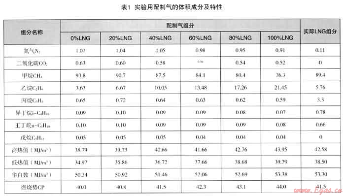 按照上述方案配制的LNG以不同比例(0、20%、40%、60%、80%、100%)與實驗室管輸氣摻混即可模擬真實情況下用戶處的氣源組分。配氣裝置見圖1,配氣時采取西氣-乙烷-氮氣多次交替進入的方式,盡可能保證均勻。監(jiān)測膜式燃氣表處的燃氣溫度,以便于進氣量的修正。配氣的目標原則是華白數(shù)與目標氣一致,燃燒勢盡可能接近。表1給出了實驗室配制的測試用氣組分及特性,以LNG比例作為標識。作為對比,同時給出了LNG的實際組分。