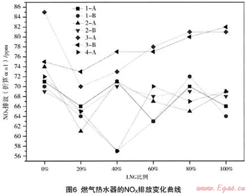 圖6為LNG比例對熱水器N0x排放的影響。N0x排放隨LNG比例的增加呈現(xiàn)無規(guī)律的變化趨勢,但基本穩(wěn)定在50×10-6~80×10-6之間。由于熱水器的燃燒室體積較小,相對散熱強烈[4],燃燒室內(nèi)溫度較低,N0x生成量很小。