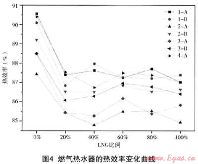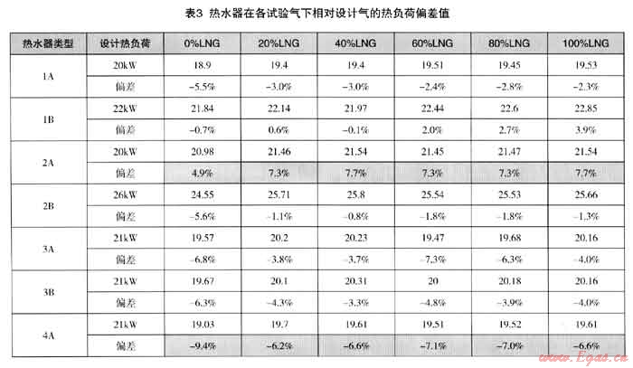 (3) 熱效率不是互換性指標。但是除了3-A和3-B以外,幾乎所有熱水器在試驗氣下熱效率均不達標,這一點應加以重視;